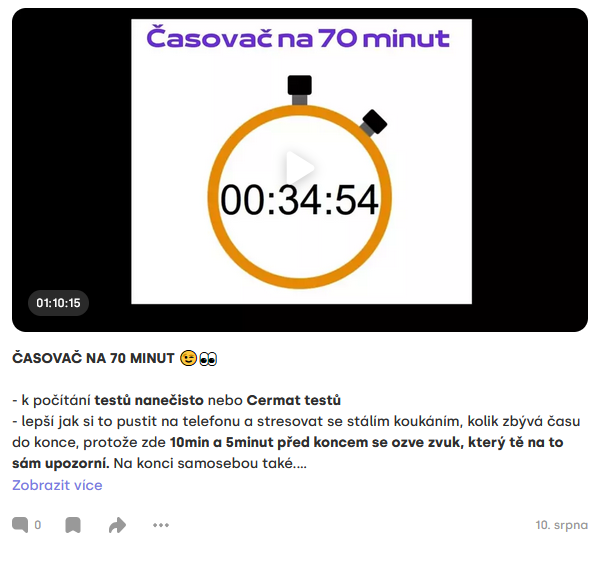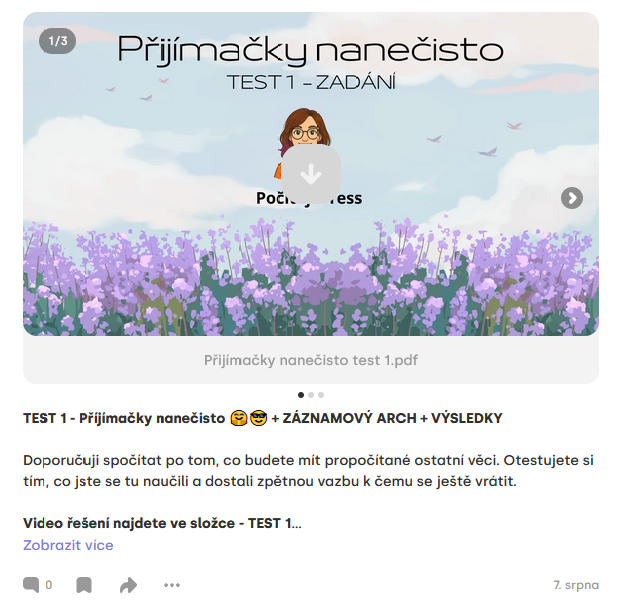Co je myšleno tím, že je živý, ale zároveň je online? Máš možnost mi kdykoliv napsat, když si z něčím konkrétním nebudeš vědět rady nebo budeš mít dotazy ohledně přijímaček samotných apod. Můžeš si pod příspěvky nebo v komunitě napsat s ostatními účastníky a pomoct si navzájem.